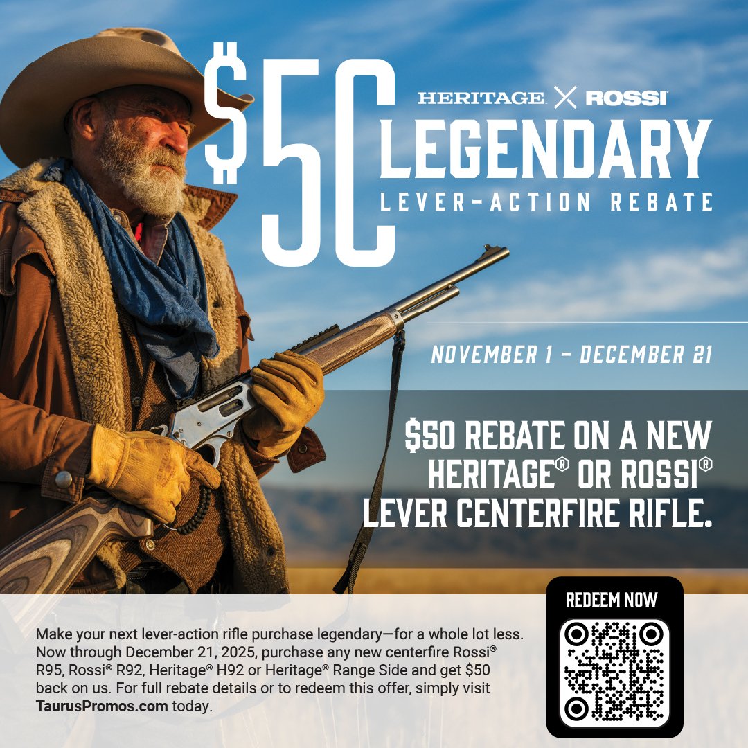 Purchase a select, NEW Heritage or Rossi Lever Action Centerfire Rifle, and Receive a $50 Rebate!